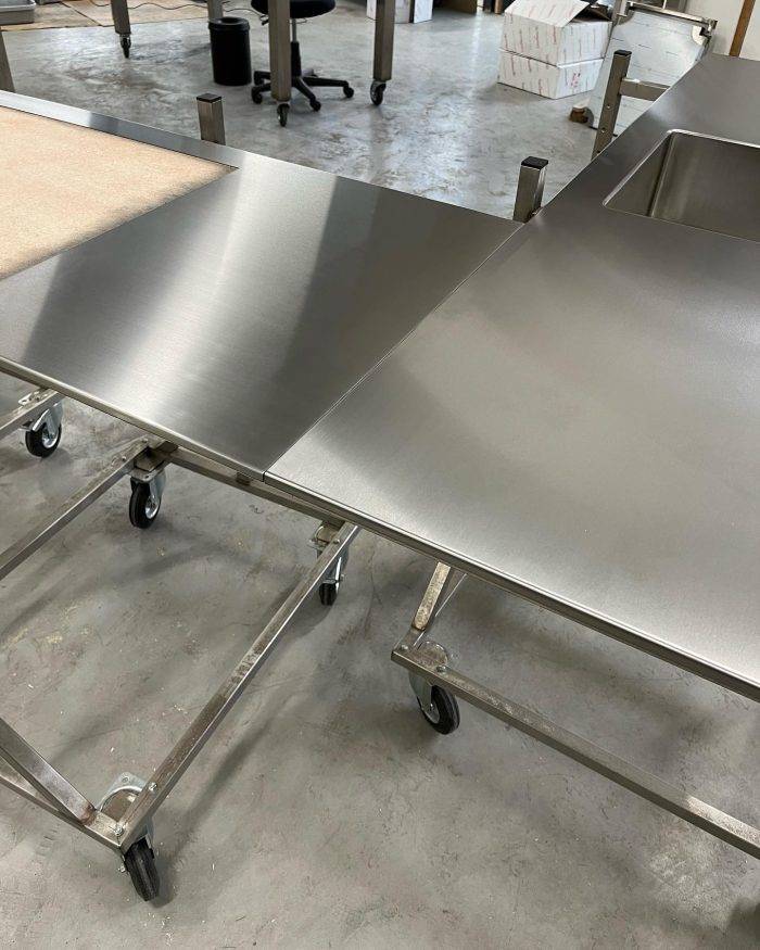 Alle roestvrijstalen keukenbladen kunnen wij leveren in diverse diktes, van 4 mm massief en werkladen 10 tot ongeveer 200 mm dik, en aan de onderzijde voorzien van multiplex. Verder zijn er diverse opties zoals tegelopstanden, blokprofielen, schuine zijdes, afgeronde hoeken en facetranden die het blad een designlook geeft. Wij leveren naast de mat geborstelde finish ook keukenbladen in een gematteerde versie of richtingloos geslepen ( Orbitaal) finish